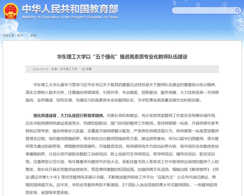 教育部网站专题报道学校“五个强化”推进高素质专业化教师队伍建设