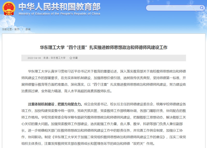 教育部网站专题报道学校“四个注重”扎实推进教师思想政治和师德师风建设工作